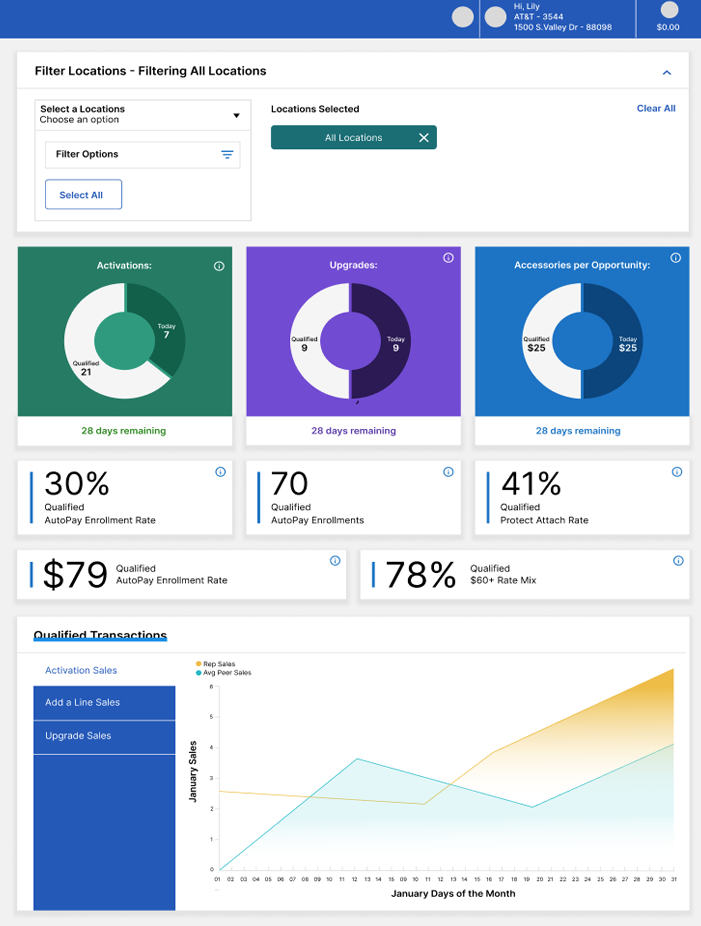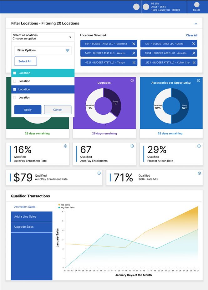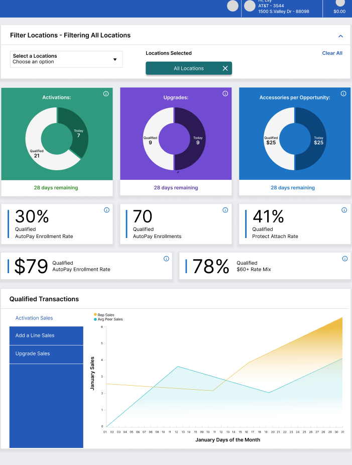 This primary screen serves as the entry point for managers, providing a real-time overview of performance across 5,300+ branded stores. By default, the screen displays data for all locations, with "All Locations" selected to ensure managers can immediately access a comprehensive view. Donut charts and progress bars dynamically highlight key performance indicators such as activations, upgrades, and accessory attach rates, allowing managers to monitor progress toward goals instantly.